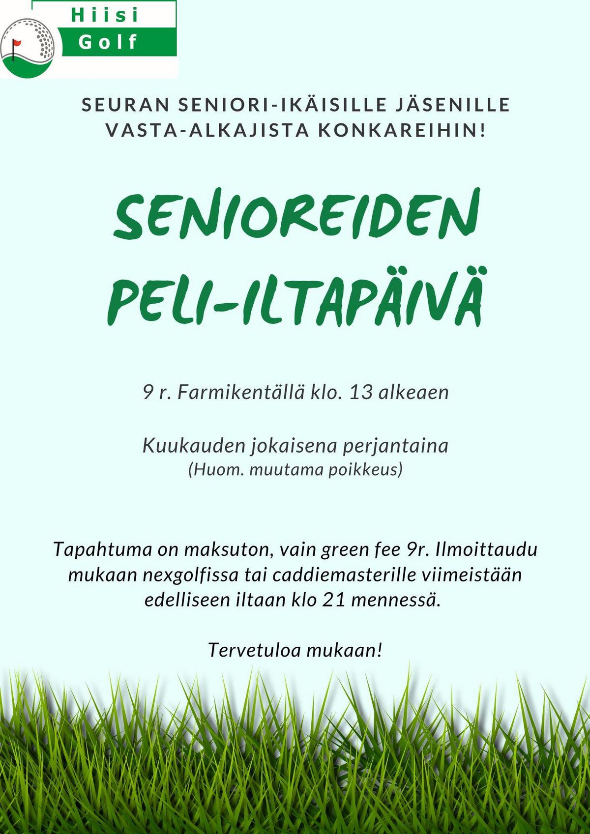 Seniori-iltapäiviin ovat tervetulleita kaikki seuran seniori-ikäiset jäsenet vasta-alkajista konkareihin! Pelataan 9 reikää Farmilla, lähdöt klo 13 alkaen. Tapahtuma on maksuton, vain green fee 9r. Ilmoittaudu mukaan nexgolfissa tai caddiemasterille viimeistään edelliseen iltaan klo 21 mennessä. Tervetuloa mukaan!