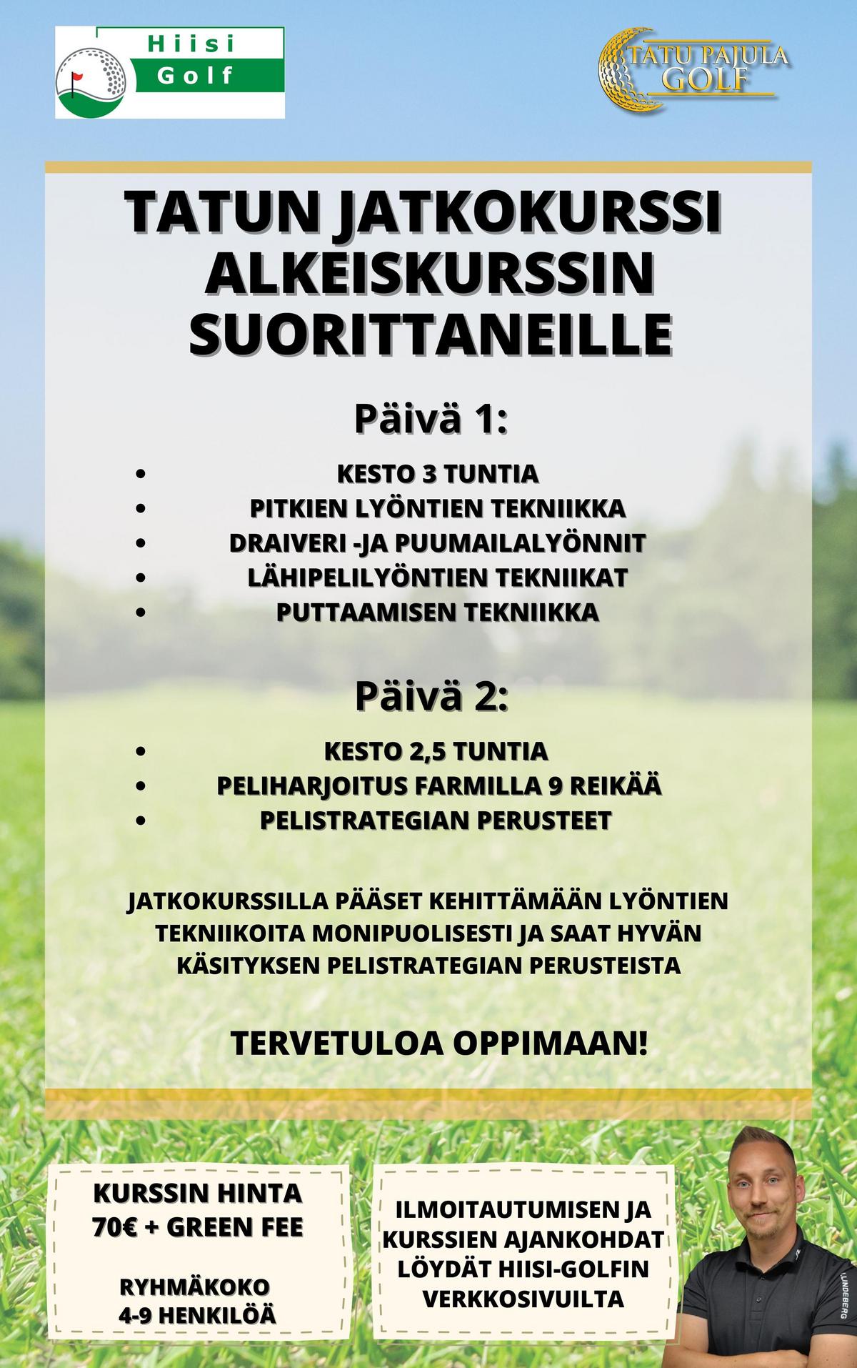 Alkeiskurssin käynneille suunnatulla jatkokurssilla ( 2pv) pääset syventämään golfin perusteita. Syksyllä -24 järjestetään kysynnän mukaan ainakin yksi kurssi.