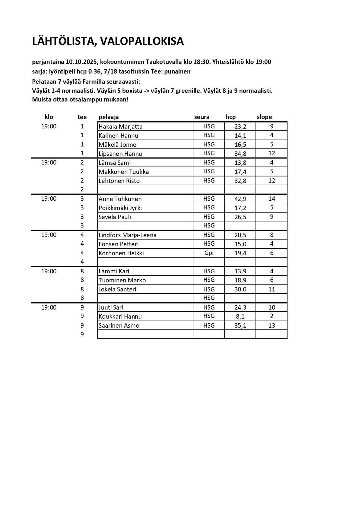 Valopallokisa, kutsu + lähtölista