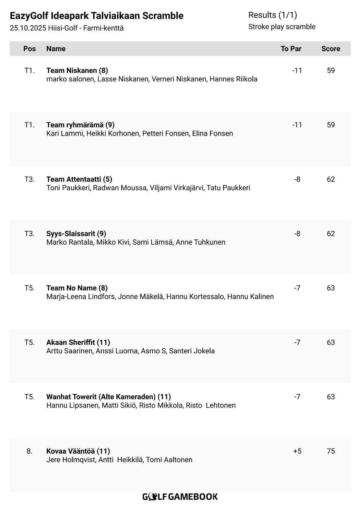 Kilpailuiden ja kentän auki pitäminen ei ole enää itsestään selvyys tähän aikaan vuodesta, joten kisat järjestetään loka-marraskuussa kelivarauksella. Tänä vuonna syyskeli mahdollisti EazyGolf Ideapark Talviaikaan Scramblen pelaamisen. Kisa pelattiin sateisena lauantaina 25.10.2025 neljän pelaajan joukkuein 18-reiän kisana Farmi-kentällä.