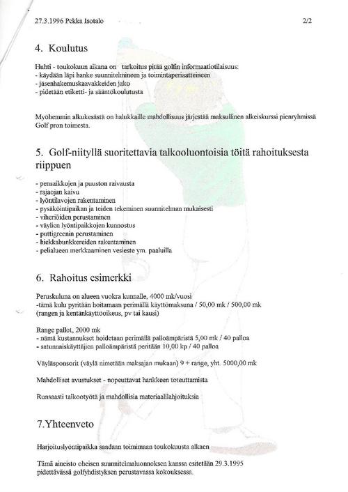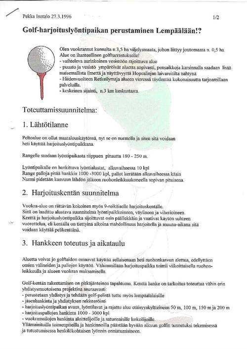 Pekka Isotalon laatiman alkuselvityksen "Golfharjoituspaikan perustaminen Lempäälään?" jälkeen seuran perustamiskokous pidettiin hänen, Riitta Härkin ja Pekka Silvennoisen toimesta 29.3.1996.