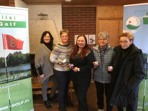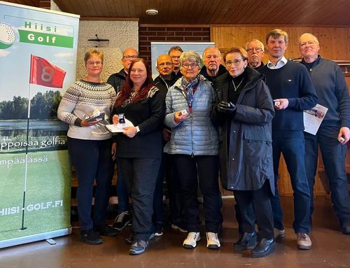 Palkitut hiisiläiset yhteiskuvassa. Golfliiton pronssisen ansiomerkin saanut Marika Civill aktiivisten hiisin naisten ympäroimänä.